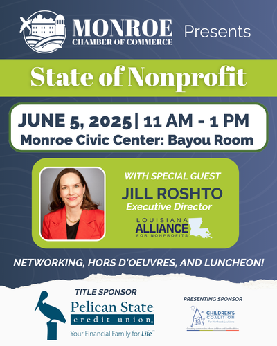 Join us on June 5th, 2025, for a valuable and informative event designed to empower nonprofit organizations in our community. Hosted at the Monroe Civic Center in the Bayou Room from 11:00 AM to 1:00 PM, this event will feature a keynote presentation by Jill Roshto from the Louisiana Alliance for Nonprofits, focusing on capacity building for nonprofits. Learn strategies and best practices to strengthen your organization, increase your impact, and achieve long-term sustainability.
